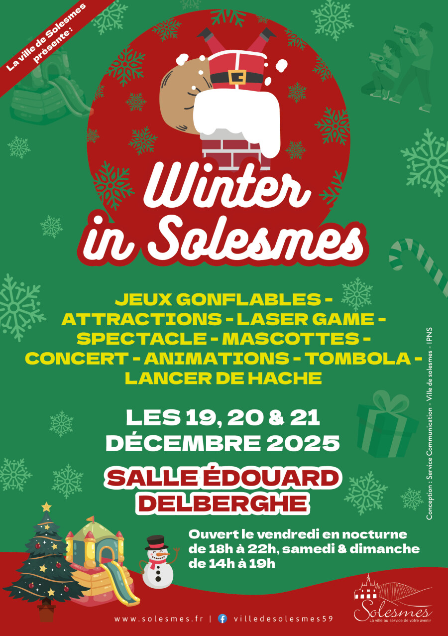 La magie de Noël s’invite une nouvelle fois dans la commune de Solesmes avec l’édition 2025 de Winter in Solesmes, un rendez-vous festif très attendu par les familles et les amateurs d’animations hivernales. Organisé par la Ville de Solesmes, l’événement aura lieu les 19, 20 et 21 décembre 2025 à la Salle Édouard Delberghe. Durant trois jours, petits et grands pourront profiter d’un programme riche en attractions, spectacles et activités immersives.